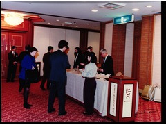 Reception table and badge delivery in the Botan Room at the Imperial Hotel in Tokyo, Japan.