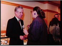 Tommaso Padoa-Schioppa speaking with a delegate during a cocktail at the Imperial Hotel in Tokyo, Japan.