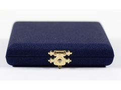Inside a blue case with a warranty certificate.