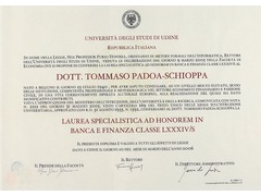 Parchment, issued by University of Udine. Honorary degree in Banking and Finance.