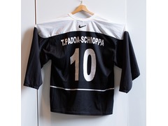 Football shirt, black and white, with script reading ‘T. Padoa-Schioppa 10’.