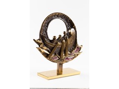 Sculpture, featuring three people on a boat, with script reading ‘Felix Italia’.